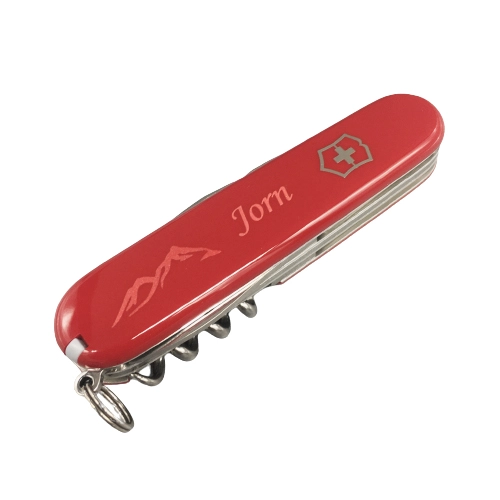Dit Zwitserse Zakmes kan indien gewenst per stuk of in een grote oplage aan de voor- en/of achterzijde gepersonaliseerd / gegraveerd worden met een tekst en / of logo naar keuze. Het logo kan enkel gegraveerd worden op het lemmet(mes) en de tekst kan op zowel de handgreep als op het mes gegraveerd worden.